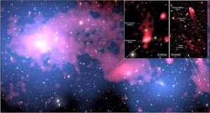 Immagine composita della regione centrale della Concentrazione di Shapley. Sullo sfondo, l’emissione ottica delle galassie osservata dall’ESO-VST in banda r; l’emissione del gas caldo che permea l’intera regione è rappresentata in blu ed è stata rilevata da XMM-Newton; l’emissione radio, rilevata da MeerKAT, è rappresentata in rosso. L’intera immagine copre un’area di cielo di circa 3×1,5 Mpc (o 10×5 milioni di anni luce). I pannelli sono uno zoom sulla galassia spogliata dalla pressione di ariete e sulla radiogalassia testa-coda e mostrano l’emissione radio a più alta risoluzione angolare (in rosso) sovrapposta all’immagine ottica in banda r dell’ESO-VST. Crediti: G. Di Gennaro